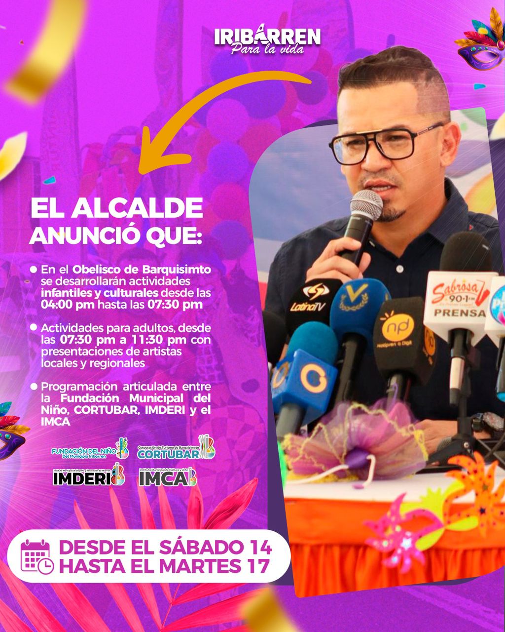 La alegría y el colorido llenarán las calles en unas fiestas carnestolendas pensadas para toda la familia. Con 11.160 funcionarios desplegados, 16 carrozas, 51 comparsas, más de 2.300 participantes, además de actividades culturales y recreativas para niños y adultos desde el Parque Recreacional El Obelisco. ¡Barquisimeto y todo el estado vibrarán con tradición y color!